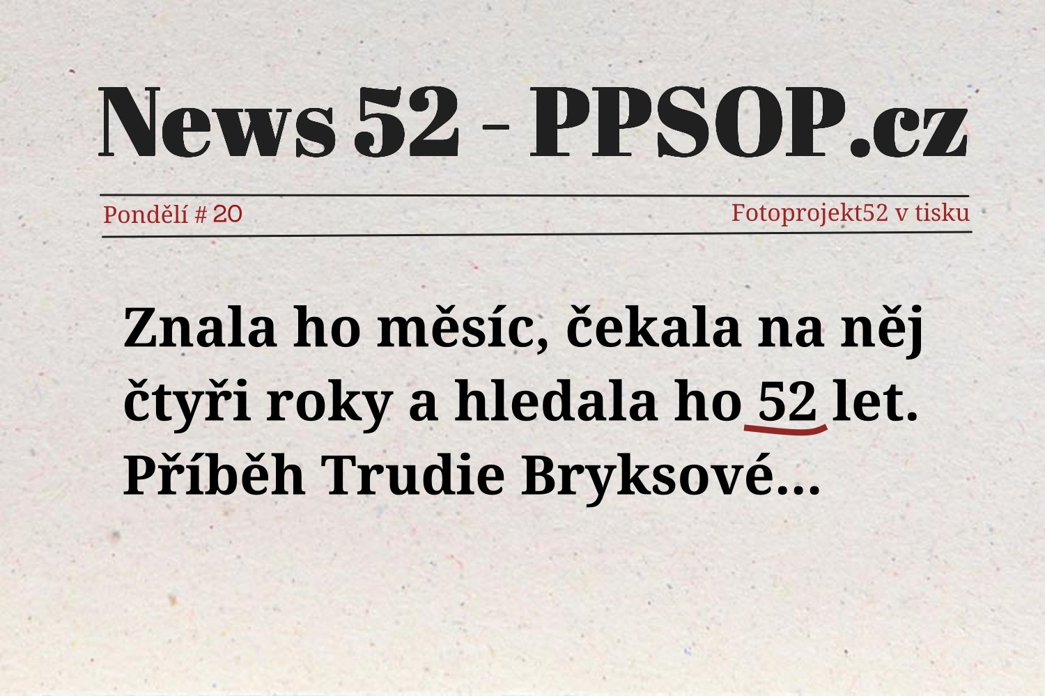 Pokud v týdnu najdete zprávu (ať už na internetu nebo v tištěných novinách), ve které se objeví číslo 52, sdílejte ji s námi na našem Facebooku v komentáři pod příspěvkem k tomu určenému.